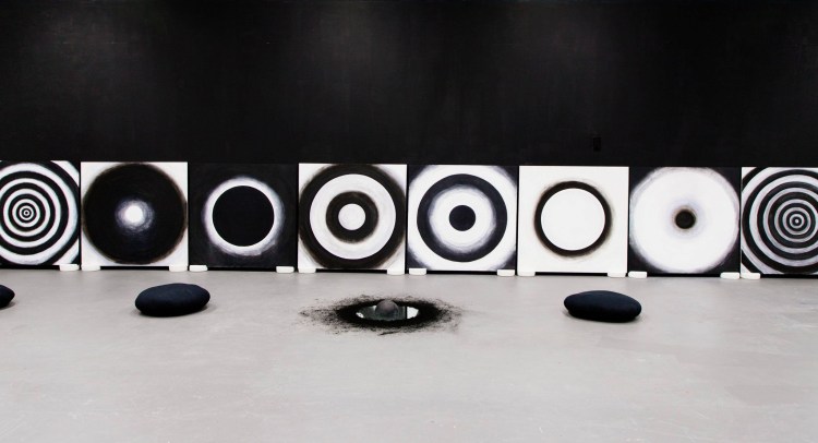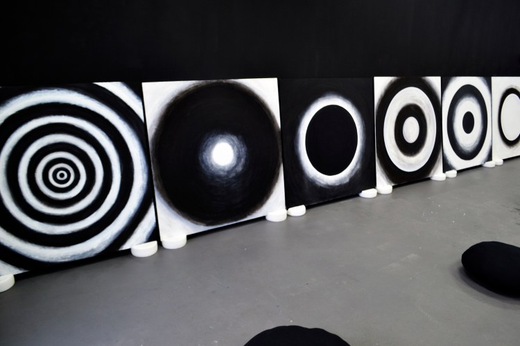 Eight large scale works on marine ply at 1.2 m x 1.2 m each, House paint, gesso, acrylic paint, charcoal and chalk pastel; Studio black house paint, four white noise machines, spray paint, cotton, assorted mixed herbs (passionflower, tulsi, brahmi, lavender, chamomile, and nettle dried botanical); pigmented corn flour, antique mirror, and clay.